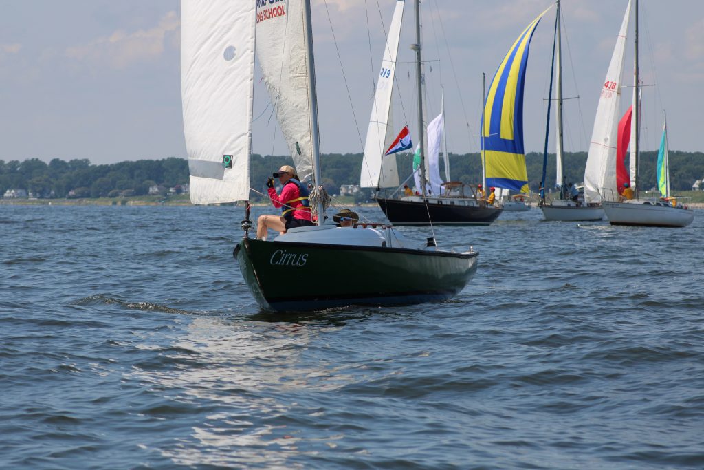 The Rainbow fleet was the second start after the CRAB boats. Nimbus started at the pin and found a couple of puffs out of the North and got out to an early lead. Chinook settled in and then set their spinnaker and immediately started moving ahead. As the boats approached the G “87” the wind from the North turned off and the boats drifted north on the flooding tide. Eventually the breeze filled in from the South with enough pressure for three Rainbows to finish. Chinook used her spinnaker to cross 1st, with Sharqi passing Cirrus on the line for 2nd and 3rd. The other boats retired due to the 4:00 pm time limit.