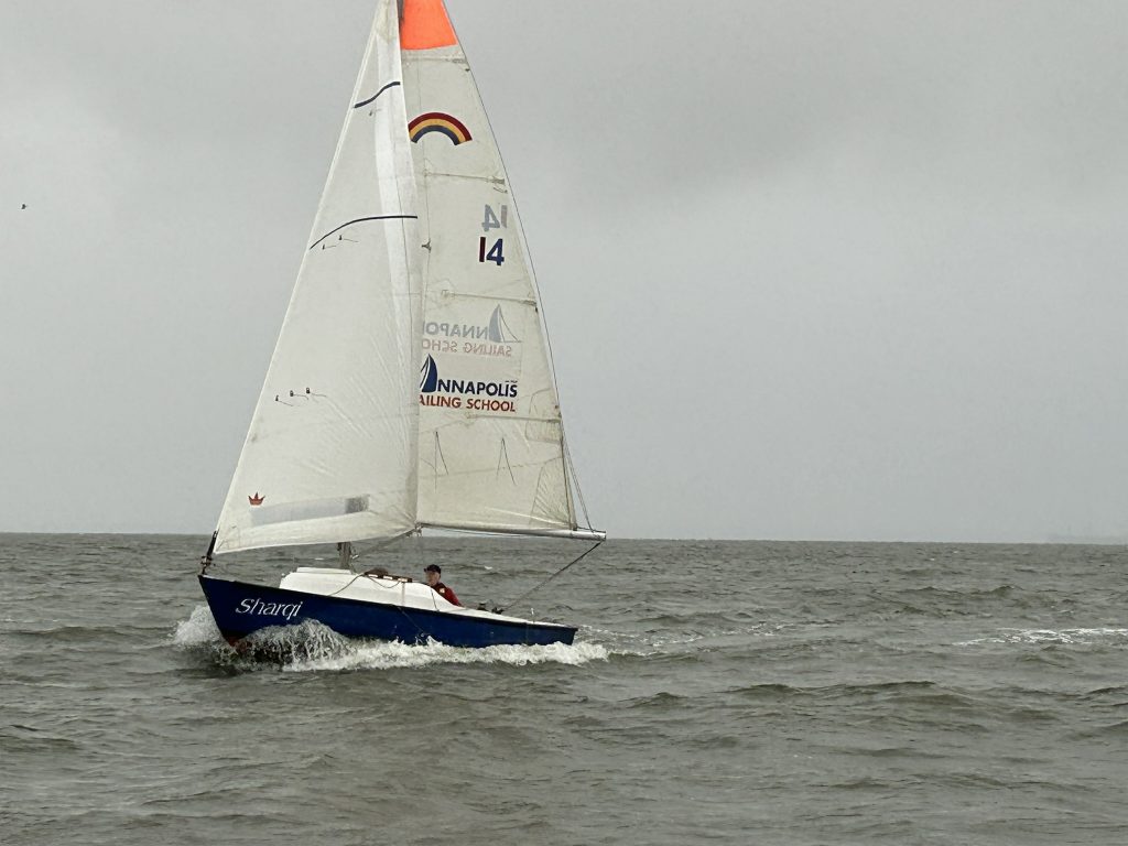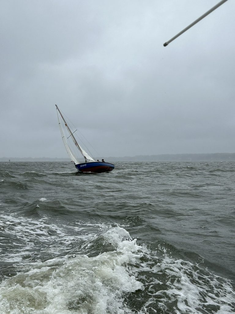 The Race Committee looked out at the steady rain, 15 knots of wind from the North East, 3 foot waves out in the Bay and said, “Let’s do a long distance race.” The course was start, round R “4” to starboard, round 1 AH to port, round R “2” to port and back to the finish. It was borderline reefing wind, so everyone had to leave the dock with a reef in but it was up to them whether they kept it in.